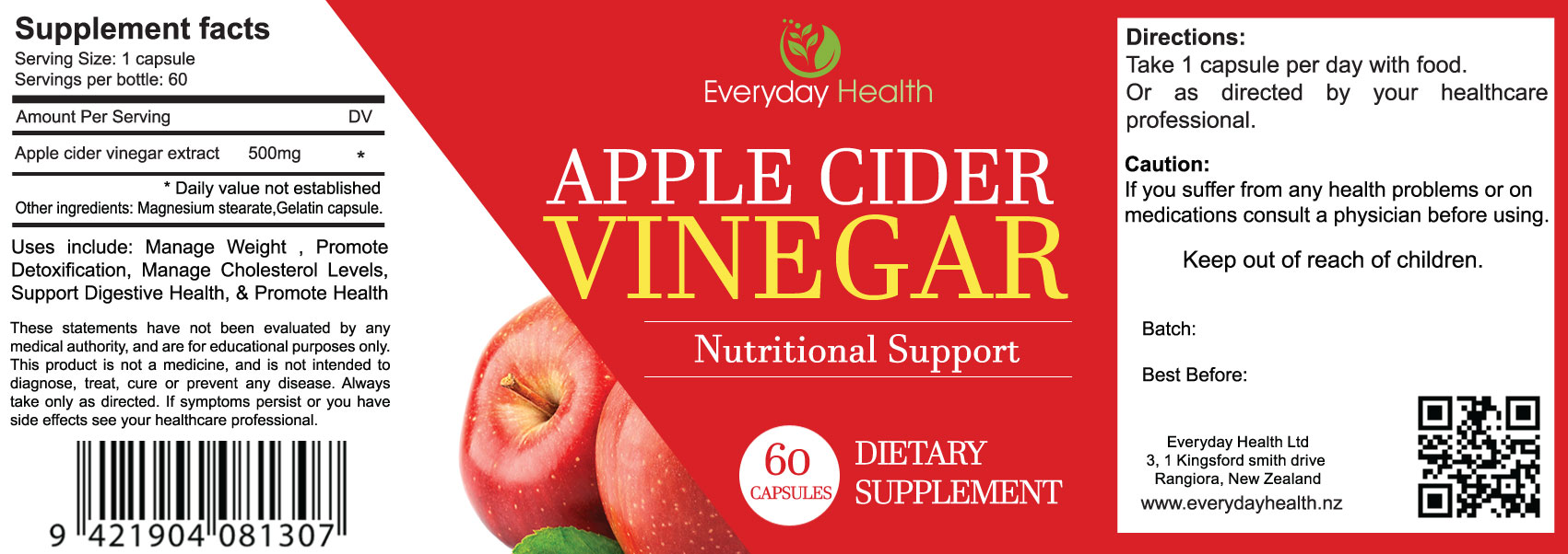 These capsules contain 100% apple cider vinegar (Mother included) that has been powdered and concentrated. 1 Capsule is equivalent to 3-4 teaspoons of liquid vinegar.